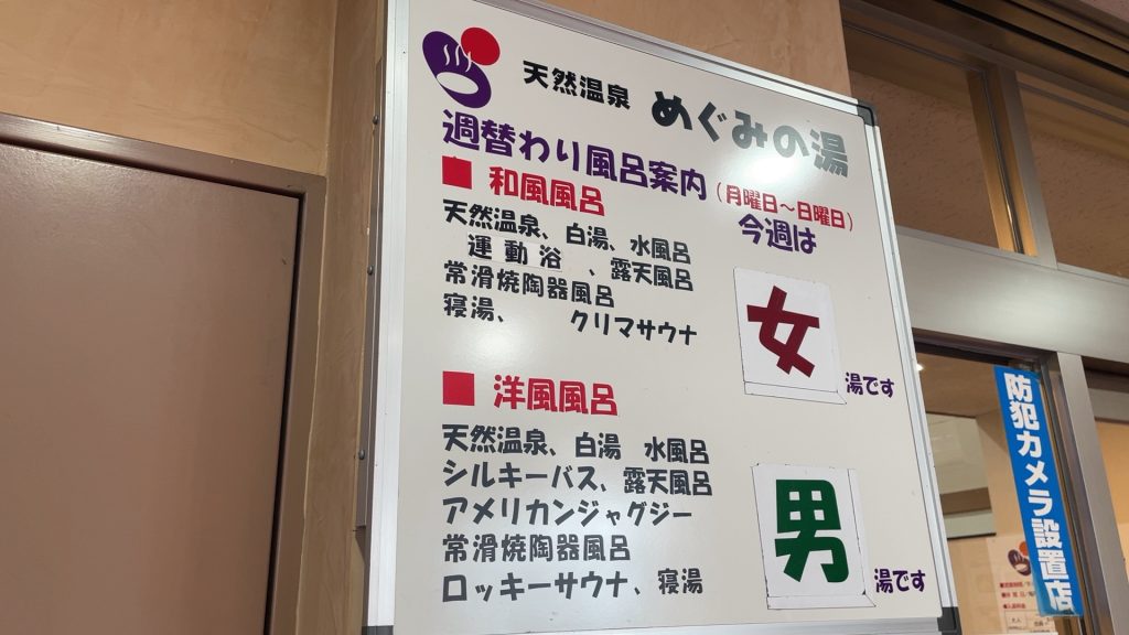 めぐみの湯の浴場は「和風風呂」と「洋風風呂」の2種類があり、男女の割り当てが週ごとに入れ替わる方式。