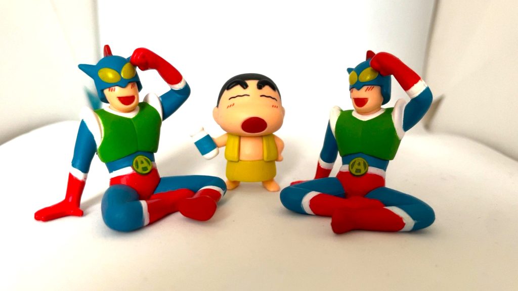 並べてみると、しんちゃんが大好きなアクション仮面(×2)と一緒にお風呂に入ったあとような光景になりました。