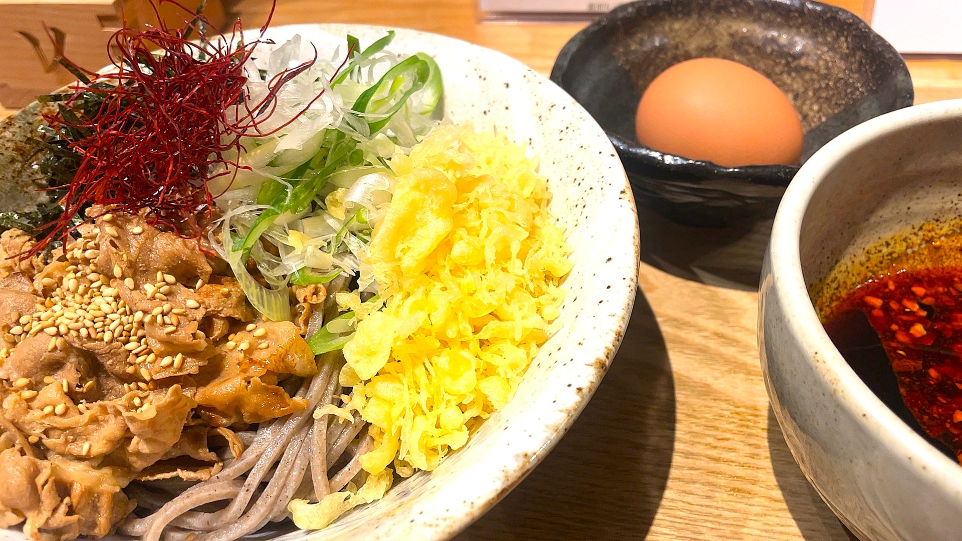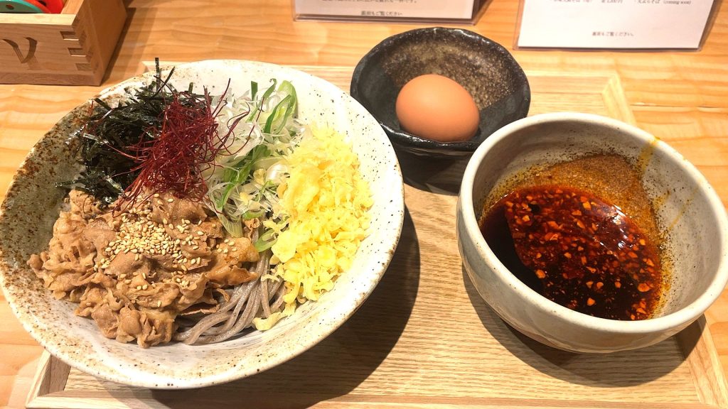 そばとラー油の入ったつけダレ、生卵が付いています。