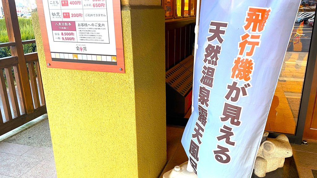 空港とのつながりは館外から感じられ、「飛行機が見える天然露天風呂」と書かれたのぼりや、飛行機のアイコンがあしらわれた暖簾などが目に入りました。